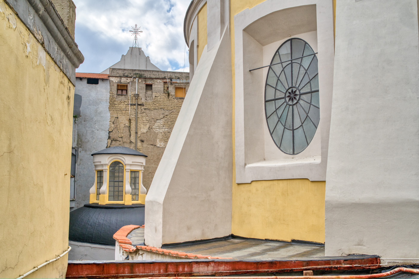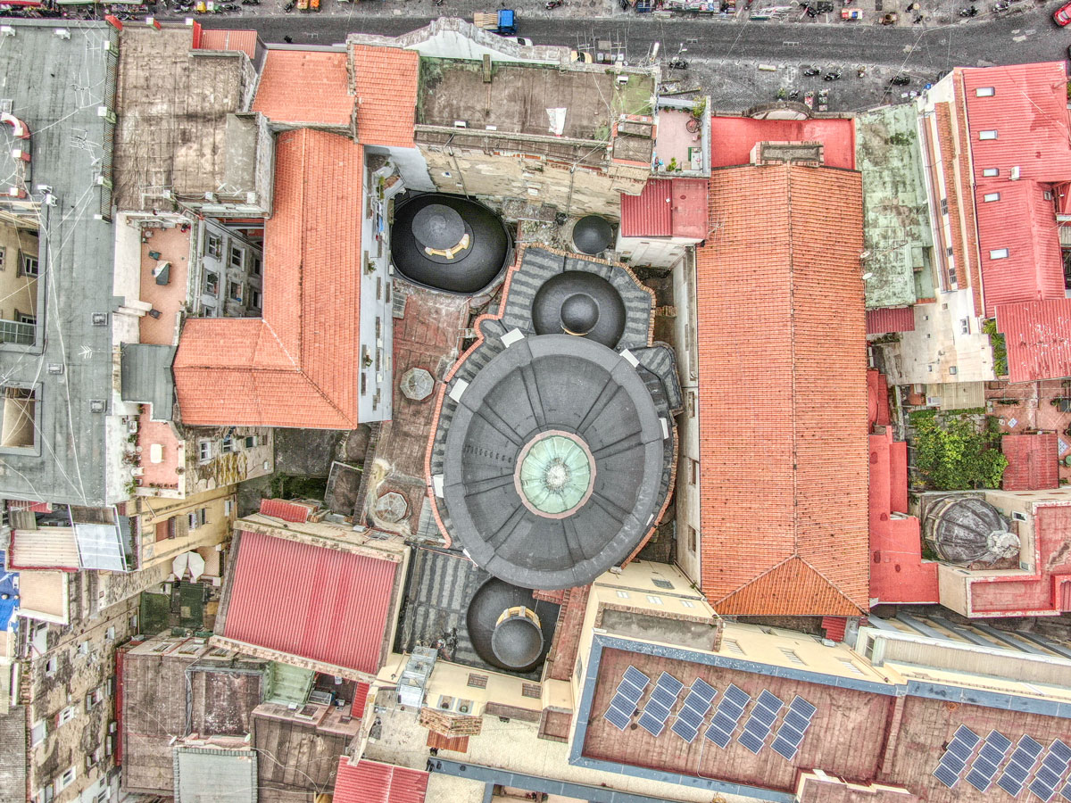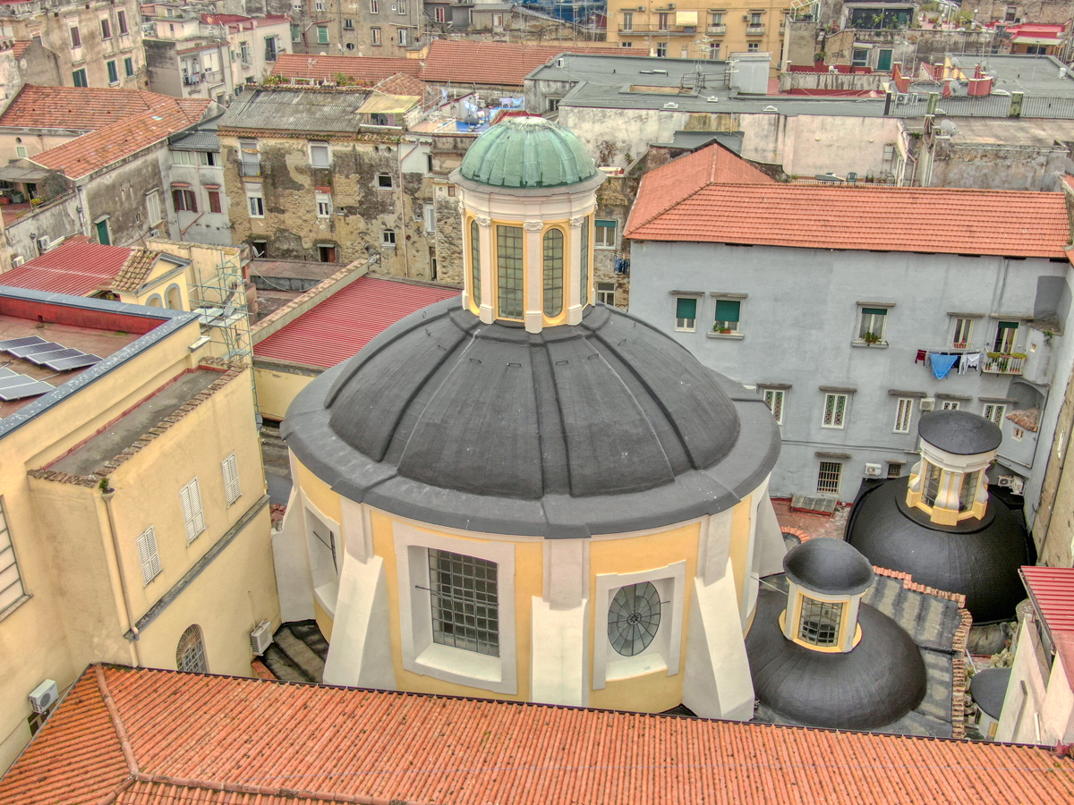 Si tratta di una complessa successione di livelli di copertura posti a quote differenti che alternano superfici piane all’estradosso delle cupole degli ambienti sottostanti. Purtroppo, il livello di degrado è abbastanza avanzato, con la presenza diffusa di macchie di umidità visibili anche all’intradosso.